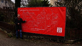 Auf 3,4 mal 1,7 Meter und in auffälligem Rot sticht der riesige Adventskalender in der Ellwanger Straße in Schriesheim ins Auge: an einem Bauzaun hängt das überdimensionierte Banner mit 24 Türen, die der SPD-Landtagsabgeordnete Sebastian Cuny täglich in der Adventszeit öffnet. Hinter jeder Tür versteckt sich eine sozialdemokratische Forderung, unter anderem die Kita-Gebührenfreiheit oder die Transformationsmodellregionen zur Stärkung unserer Industrie. Sebastian Cuny dazu: „Alle unsere sozialen Ziele will ich nicht verraten, es soll ja eine Überraschung werden – wie bei jedem Adventskalender.“