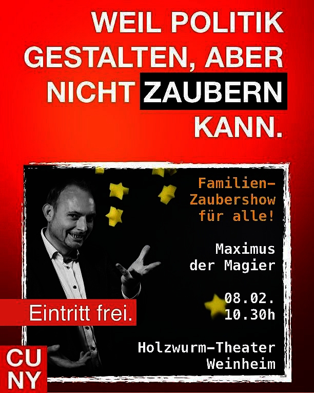 Da kommen große und kleine Zauberfans auf ihre Kosten: SPD-Landtagsabgeordneter Sebastian Cuny lädt zur Familien-Zaubershow mit Maximus dem Magier ins Holzwurm-Theater nach Weinheim ein. Unter dem Motto „Weil Politik gestalten, aber nicht zaubern kann“ zeigt der regional bekannte Zauberer seine magischen Tricks dem Publikum.