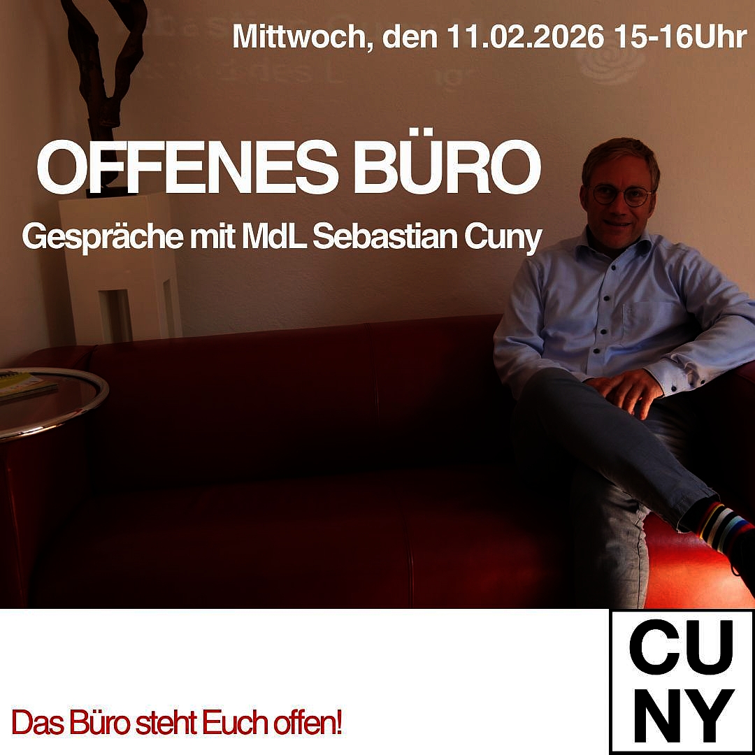 Nach dem Offenen Büro nur für Erstwählende am 6. Februar lädt der SPD-Landtagsabgeordnete Sebastian Cuny am Mittwoch, 11.2., von 15 bis 16 Uhr ins Offene Büro für alle Bürger:innen: „Gute Politik beginnt mit Zuhören“, betont Sebastian Cuny seinen Politikstil. „Der Austausch mit Bürger:innen liegt mir am Herzen. So erfahre ich direkt, wo es Probleme gibt und kann meine Unterstützung anbieten“, so Sebastian Cuny über seine Einladung zum „Offenen Büro“ in seinem Schriesheimer Wahlkreisbüro.
