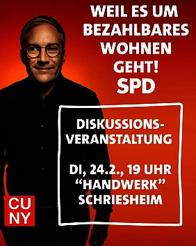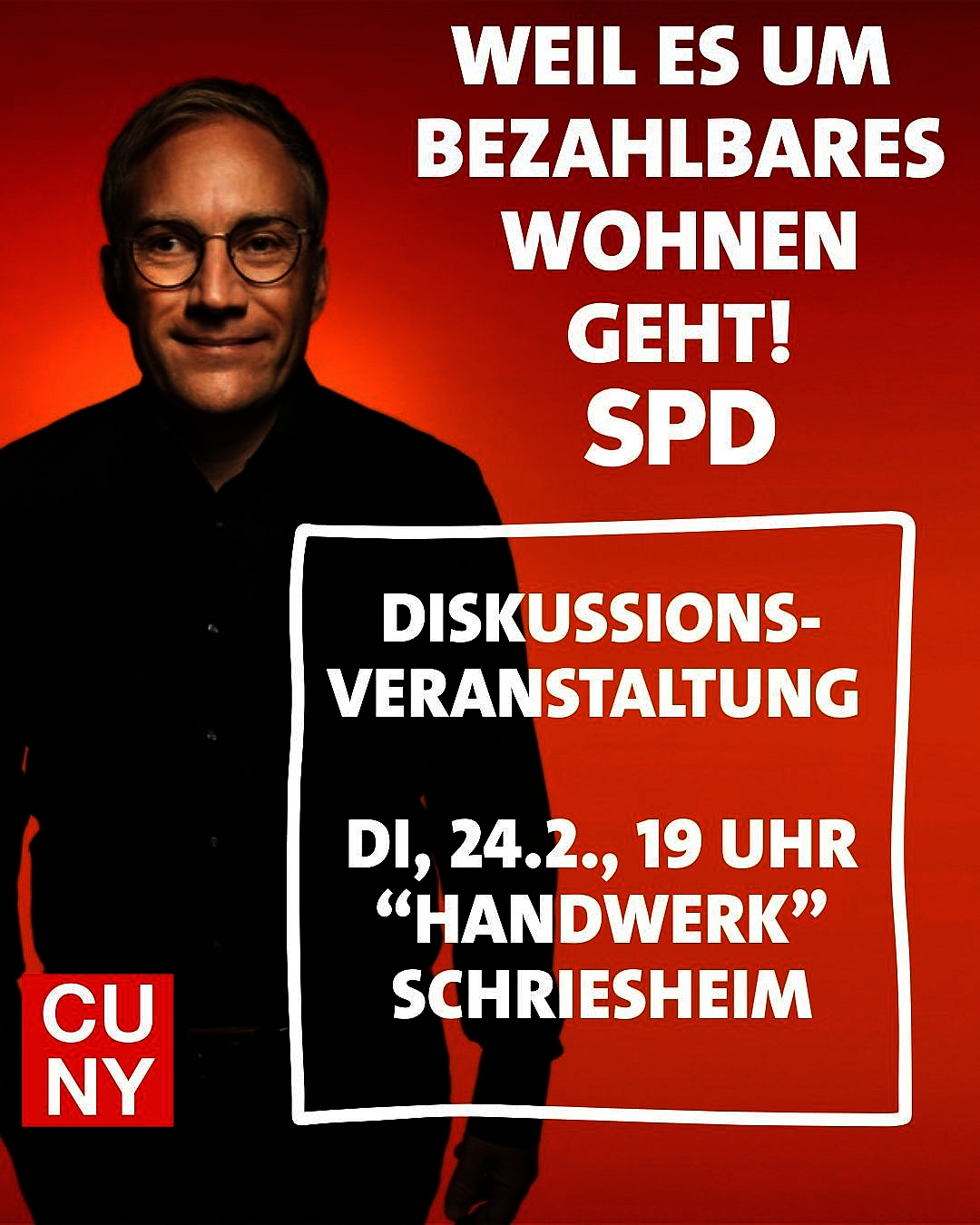 SPD-Landtagsabgeordneter Sebastian Cuny diskutiert am Dienstag, 24. Februar, in Schriesheim über diese und weitere Fragen mit dem ehemaligen Bundestagsabgeordneten Lothar Binding, der auch viele Jahre Vorsitzender des Mietervereins Heidelberg und Umgebung war, und Florian Grabarek, Geschäftsführer der Immobilien GmbH der VR Bank Rhein-Neckar. Die Veranstaltung findet im „HandWerk“ statt und beginnt um 19 Uhr.