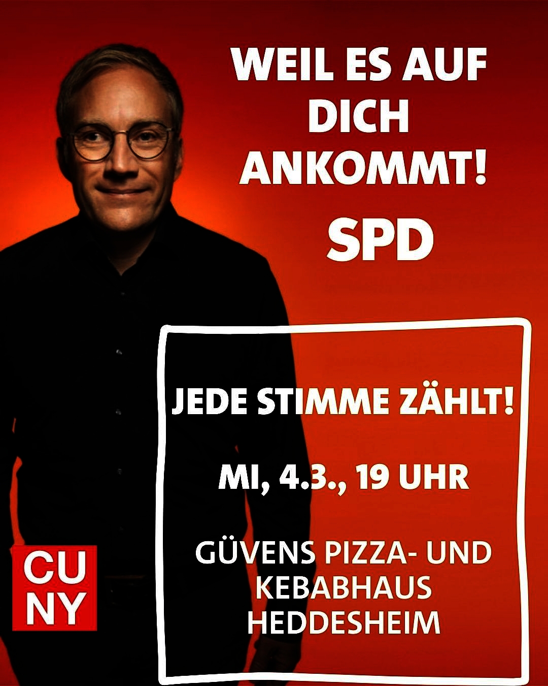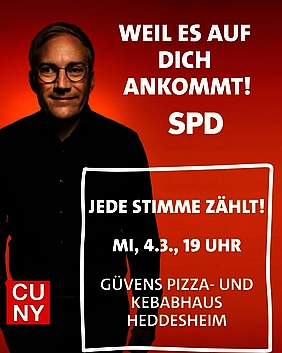 „Bei der Wahl kommt es auf dich und auf deine Stimmen an“, so das Motto der letzten von zehn Themenwochen des SPD-Landtagsabgeordneten Sebastian Cuny. Am Mittwoch, 4. März, wird er ab 19 Uhr mit Prof. Dr. Felix Hörisch, Politikwissenschaftler aus Schriesheim, in Güvens Kebab- und Pizzahaus in Heddesheim (Bahnhofstraße 14) über das neue Wahlrecht, taktisches Wählen und die Bedeutung der zwei Stimmen sprechen. Außerdem wird Hörisch aus wissenschaftlicher Sicht über die Bedeutung der Mobilisierung von Wählerinnen und Wähler referieren und erklären, warum dies auch inhaltlich wichtig ist für die Demokratie und den Sozialstaat. Alle Interessierten sind herzlich eingeladen, vorbeizukommen, mitzudiskutieren und Fragen zu stellen.