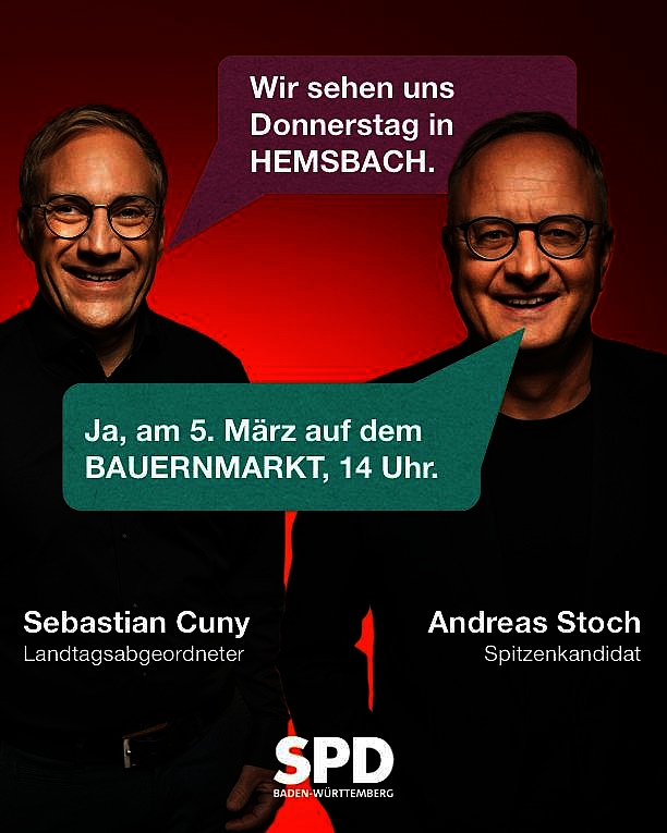 Drei Tage vor der Landtagswahl ist der SPD-Spitzenkandidat Andreas Stoch zu Besuch im Wahlkreis von Sebastian Cuny. Am Donnerstag, 5. März, werden die beiden Sozialdemokraten zuerst beim Tür-zu-Tür-Wahlkampf in Hemsbach unterwegs sein und danach zwischen 14 und 15 Uhr am Infostand auf dem Hemsbacher Bauernmarkt vor dem Rathaus allen Interessierten Rede und Antwort stehen.